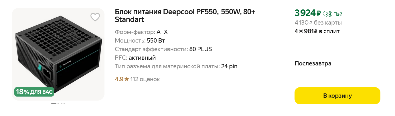 В своих блогах про сборки игровых ПК я часто использую блоки питания с избыточной мощностью, за что получаю немало критики в комментариях. Ведь на первый взгляд избыточная мощность блока питания совершенно бесполезна и не даст вам прибавки в играх ни на один FPS. Но не стоит забывать, что чем больше у блока питания запас по мощности, тем меньше он будет греться и меньше шуметь, а электролитические конденсаторы — самое слабое звено схемотехники в БП, проработают дольше. И когда на полке магазина лежит Deepcool PF450 за 3750 рублей, а на 100 ватт более мощный Deepcool PF550 стоит всего лишь на 174 рубля дороже, то экономить здесь будет очень опрометчиво.
