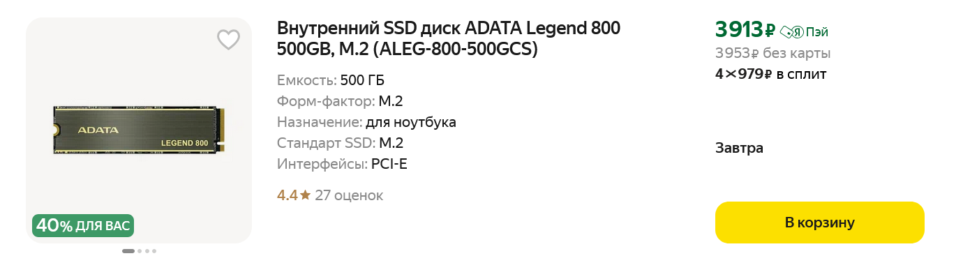 Вот такой набор полезных программ на все случаи жизни стоит иметь практически на любом ПК и ноутбуке в 2024 году, и он не займет много места на вашем SSD-накопителе. И, если вы не играете в самые современные игры, вес которых достигает сотен гигабайт, то SSD объемом 500-512 ГБ сегодня вполне хватит для Windows, всех нужных программ и файлов пользователя. Стоят такие модели в районе 4000 рублей, и на Яндекс Маркете особенно популярны модели от ADATA, например, ADATA Legend 710 или более быстрые ADATA Legend 800 и ADATA Legend 850.