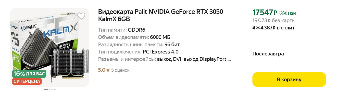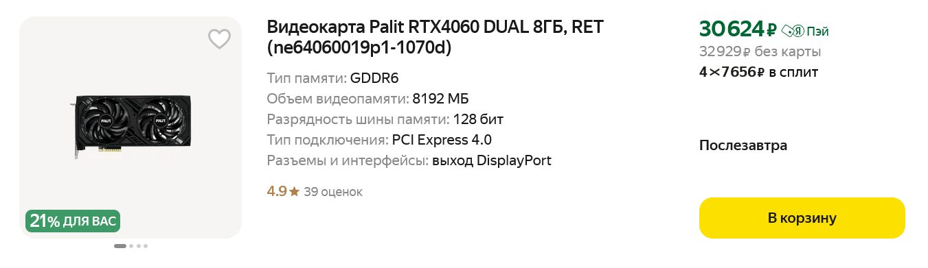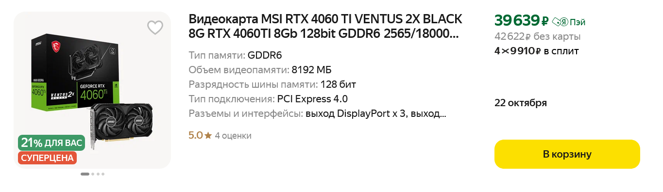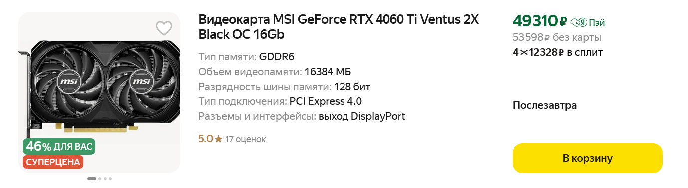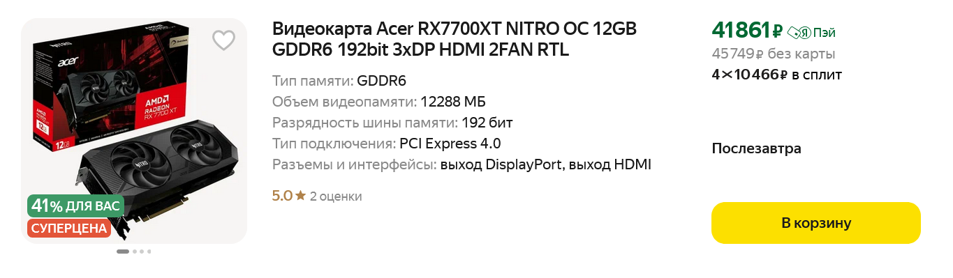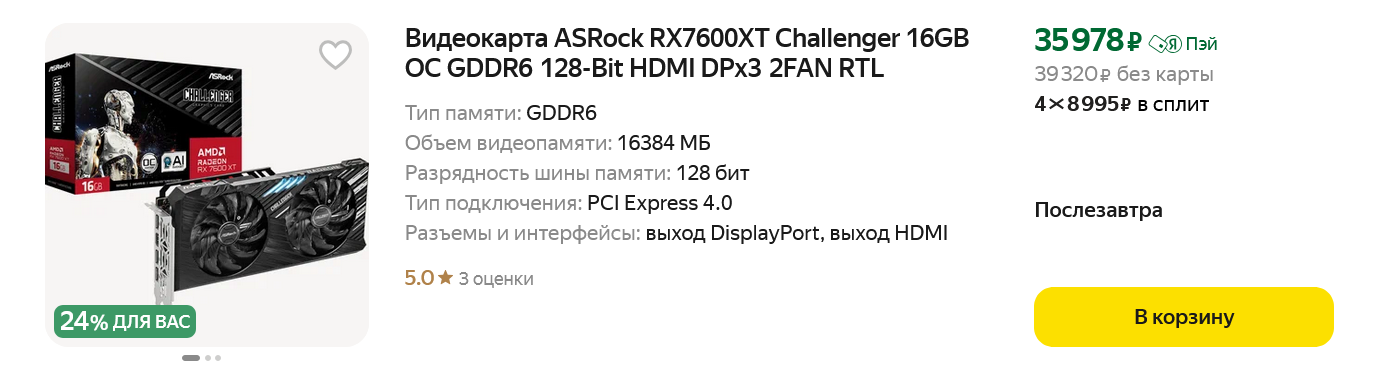 Еще одна модель, стоящая в районе 35000 рублей, и имеющая большой объем видеопамяти —Radeon RX7600 XT, у которой ее целых 16 ГБ, но, чтобы найти эту модель по столь низкой цене, придется постараться. Низкий спрос на видеокарты AMD делает свое дело и цены идут вниз даже на такие привлекательные модели.