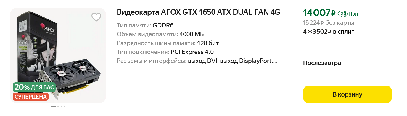 Поэтому начнем сегодня мы именно с GeForce GTX 1650, модели, которая является практически безальтернативным выбором для обладателей старых ПК с шиной PCI Express 3.0, которые хотят поиграть в новые игры на минимальных настройках графики. И часто такой выбор делается не из-за экономии, а потому, что играть в игры на ПК хочется все меньше и отдавать крупную сумму за видеокарту, которая будет простаивать большую часть времени — очень непрактично. А GeForce GTX 1650 стоит недорого, еще долго будет пригодна для декодирования видео, а если ваш выбор — игры прошлых лет, то этой модели хватит еще очень надолго, так как низкое энергопотребление делает ее весьма живучей и надежной моделью. Эту и все остальные видеокарты из этого списка будем искать на Яндекс Маркете, где можно найти некоторые модели по очень низкой цене.