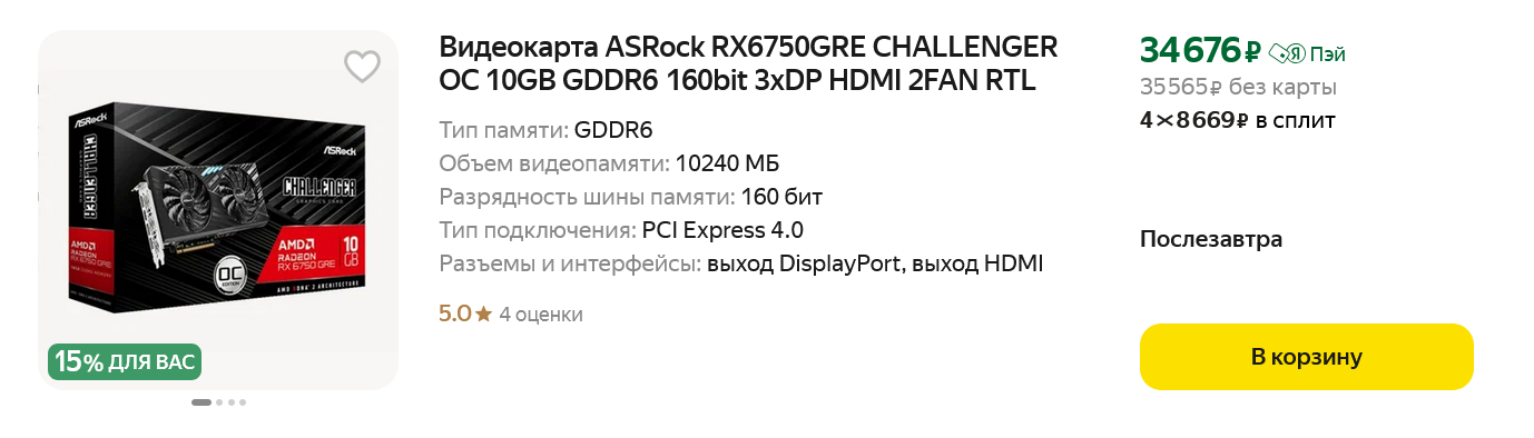Мне удалось найти GeForce RTX 4060 на Яндекс Маркете всего за 30624 рубля, но не факт, что такие цены будут доступны на момент выхода статьи в печать, иногда они успевают измениться даже за время написания блога. И если вы не можете решиться на покупку видеокарты с 8 ГБ видеопамяти в 2024 году, а решиться на это очень трудно, особенно если вы делаете апгрейд с GeForce GTX 1070, которая имела такой объем семь с половиной(!) лет назад, то присмотритесь к следующей видеокарте в списке. Это ASRock AMD Radeon RX 6750 GRE Challenger OC, модель с 10 ГБ VRAM, которая обгоняет GeForce RTX 4060 во многих нетрассированных играх, а стоит лишь немногим дороже. И не стоит пугаться аббревиатуры GRE в названии, она означает "Golden Rabbit Edition" и не имеет ничего общего с майнингом, а означает то, что видеокарта выпускалась для азиатского рынка.