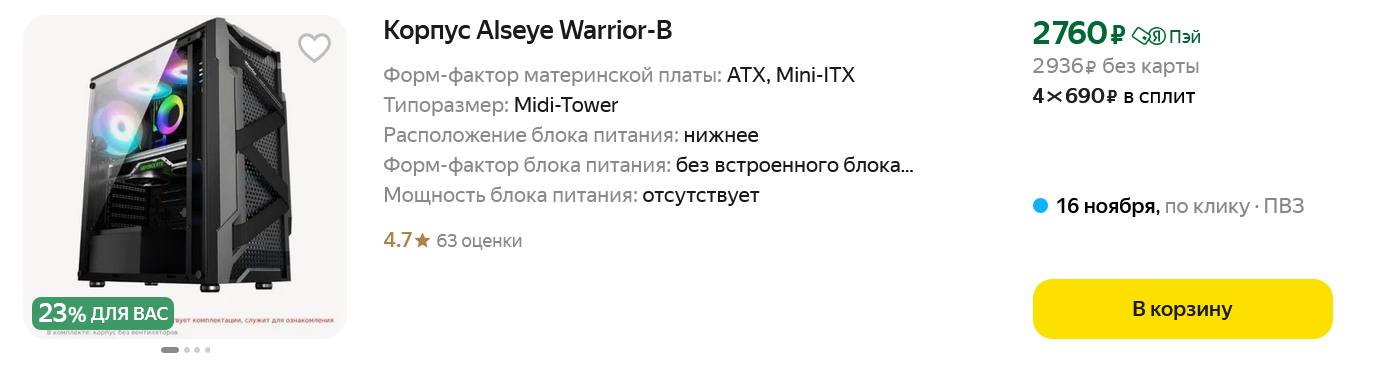 Начав выбирать на Яндекс Маркете корпус, и выставив границу максимальной цены в 3000 рублей, я сразу увидел корпус Alseye Warrior-B и понял, что дальше искать нет смысла, это великолепная по дизайну и цене модель, с хорошей вместимостью и отличной продуваемостью.