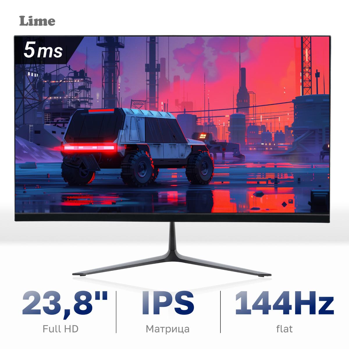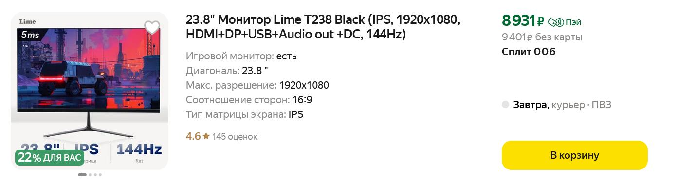 Стоимость нашей сборки уже составляет 65100 рублей с картой Пэй, а нам надо еще найти монитор, и это явно будет модель с большей диагональю, чем тот, что стоит в ноутбуке Maibenben X725. И в идеале нам нужна модель с такой же частотой развертки, чтобы этот ПК не уступал ноутбуку ни в чем, и такая модель сразу нашлась. Это Lime T238 Black с диагональю 23.8", матрицей IPS с разрешением 1920x1080 точек и разверткой в 144 Гц. И стоит это чудо даже дешевле 9000 рублей. А если вас смущает фирма-производитель — посмотрите на количество отзывов, похоже, что Lime T238 Black расхватывают как горячие пирожки.