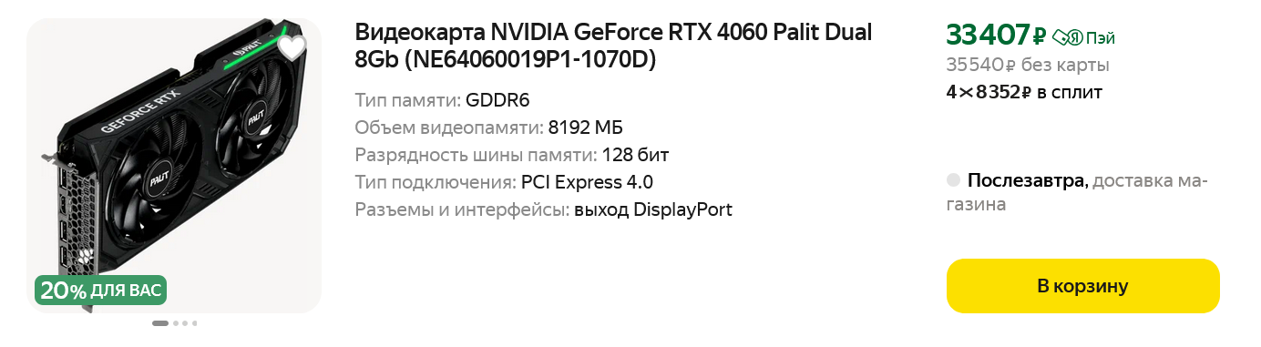 С поиском дискретной видеокарты GeForce RTX 4060 никаких проблем нет, тепловыделение у них небольшое и двухвентиляторной модели с парой теплотрубок в радиаторе будет вполне достаточно, смысла переплачивать за более навороченное охлаждение и большое число фаз питания нет никакого. Решать будет только цена и мы возьмем довольно недорогую модель GeForce RTX 4060 Palit Dual.