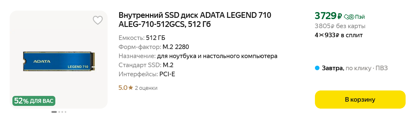 Для игрового применения вполне хватит бюджетного M.2 SSD, заметить разницу с более шустрой моделью, которая стоит в два раза дороже вы просто не сможете. Поэтому наш выбор — дешевый и качественный SSD ADATA LEGEND 710 с индексом ALEG-710-512GCS и объемом 512 ГБ. Да и признаться, вряд ли в Maibenben X725 стоит более шустрый SSD, чем ADATA LEGEND 710, хотя данных о модели на сайте нет.