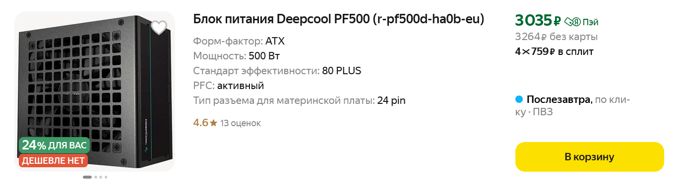 Постоянные читатели моих блогов могут сразу пролистывать этот абзац и переходить к рассмотрению выбранного корпуса, так как здесь будет опять стоять присутствующий в каждой недорогой сборке БП Deepcool серии PF. Ну а для остальных читателей уточню, что это лучшая модель из самых недорогих, которая лишена недостатков устаревших бюджетных моделей, и имеет не только активный PFC, но и сертификацию 80 PLUS. B неплохой набор защит: OPP - от перегрузки, OVP - от подачи повышенного напряжения, SCP - от короткого замыкания и UVP - от подачи пониженного напряжения. Мы возьмем модель мощностью 500 ватт — Deepcool PF500, хотя можно было бы обойтись и 350-ваттником, но с таким запасом мощности блок питания будет холоднее и проживет дольше, да и шуметь будет не так сильно.