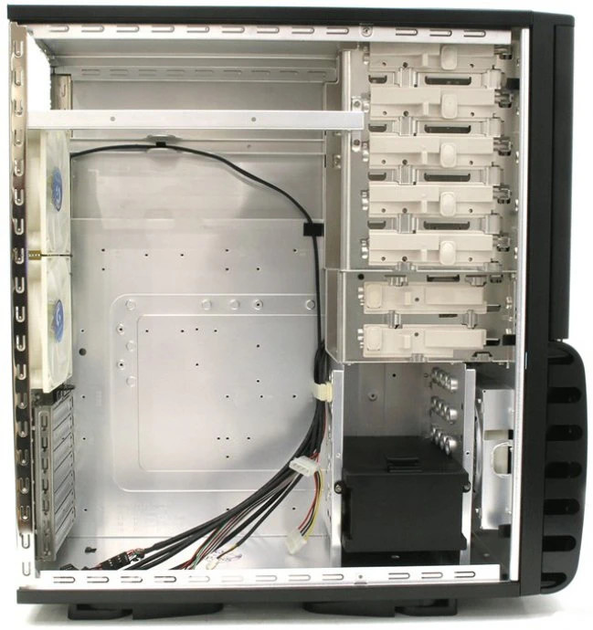 Эта модель уже 2007 года, и стоит отметить, что, перерыв кучу обзоров корпусов, найти еще какие-нибудь подходящие модели из 2007-го, а тем более 2006-го года, мне не удалось. Большинство производителей продолжали использовать привычную схему с одним вентилятором диаметром 120-мм на выдув, которой вполне хватало для "железа" того времени. А вот в 2008 году появилось уже гораздо больше интересных моделей, которые гораздо ближе к современным корпусам, и уже встречаются экземпляры с нижним расположением блока питания.
