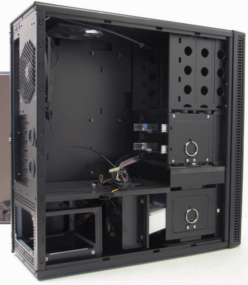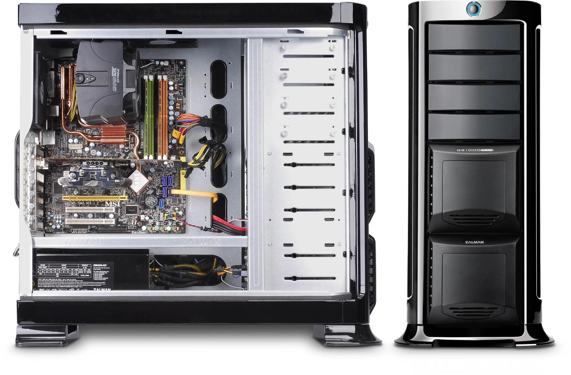 Еще один интересный корпус из 2008-го года — громадный Zalman GS1000, уже может похвастаться удобным поддоном для укладки кабелей и возможностью установки четырех вентиляторов диаметром 120-мм. В Zalman GS1000 можно установить видеокарту длиной до 330 мм, а блок питания можно повернуть по-современному, вентилятором вниз. Кстати, в те годы большинство блоков питания имели слишком короткие провода, поскольку были рассчитаны на корпуса с верхним расположением БП. И найти подходящий БП, особенно для столь высокого корпуса, как Zalman GS1000, было тем еще квестом.