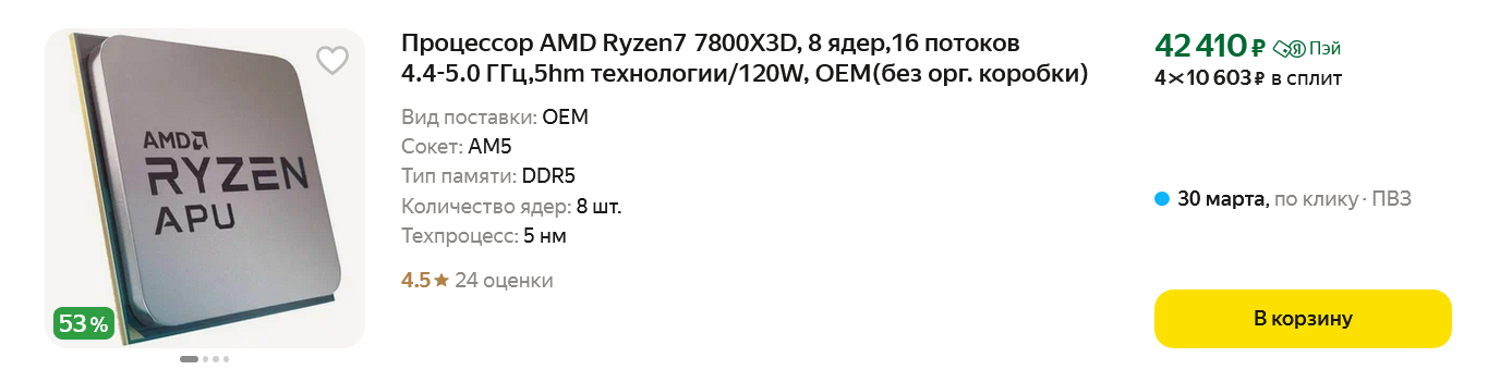 И на первое место я бы поставил Ryzen 7 7800X3D, который сегодня на Яндекс Маркете можно найти примерно за 42000 рублей. Этот процессор еще долго будет показывать отличный FPS в играх за счет большого количества кэша третьего уровня.