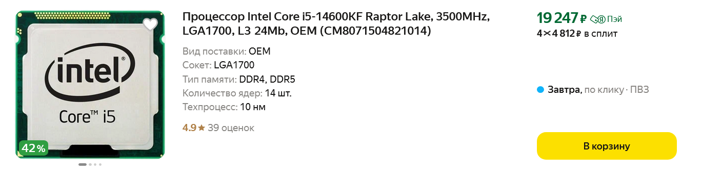 Второй кандидат в долгожители — Core i5-14600KF, очень быстрый шестиядерник, цена на который опустилась уже ниже 20000 рублей. Он будет долго актуальным за счет дополнительных восьми малых ядер, которые увеличивают число обрабатываемых им потоков до 20.