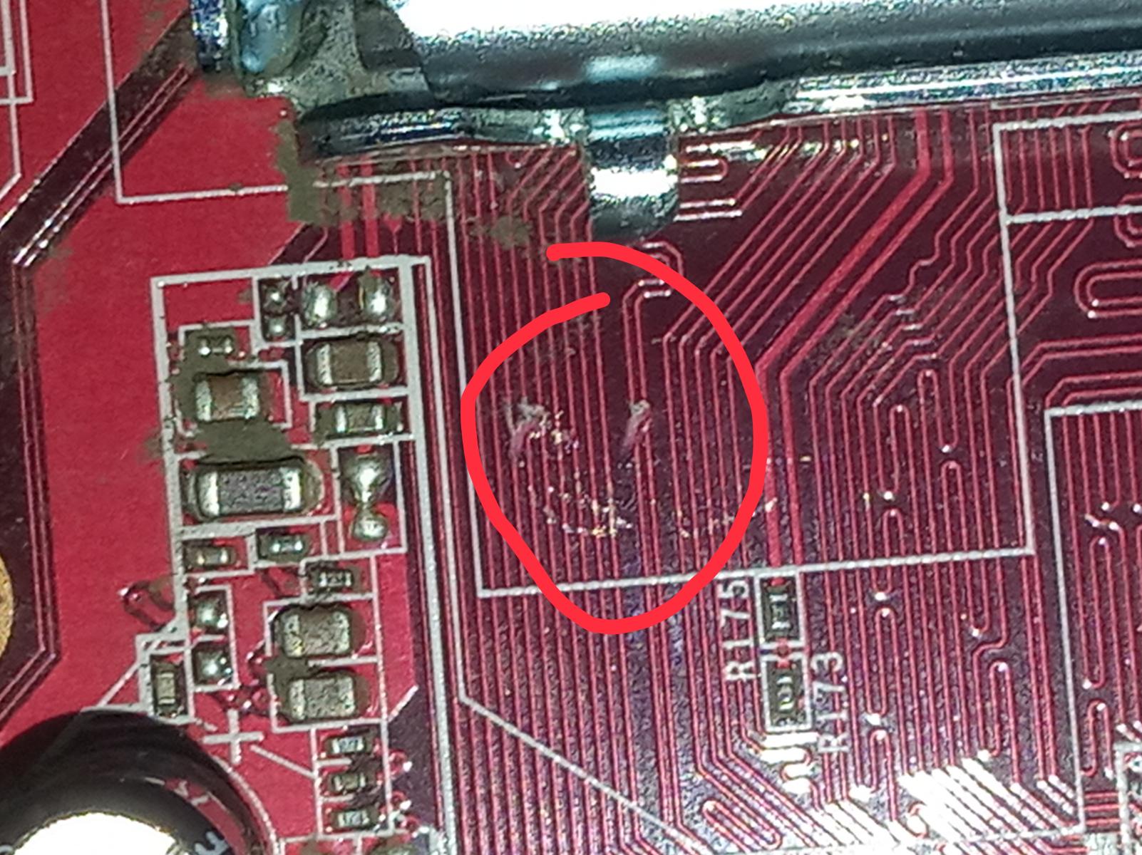 Повредить дорожки на материнской плате и сбить компоненты можно и с помощью видеокарты или плат расширения, устанавливая их в посадочные места. На некоторых платах даже заметны царапины в том месте, где в них упиралась рамка крепления видеокарты. Поэтому ставить их надо аккуратно, без перекоса, и следить, чтобы зубец рамки крепления сразу попадал в фиксирующее отверстие, а не елозил по плате.