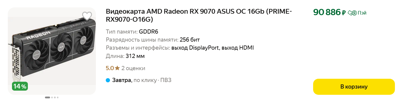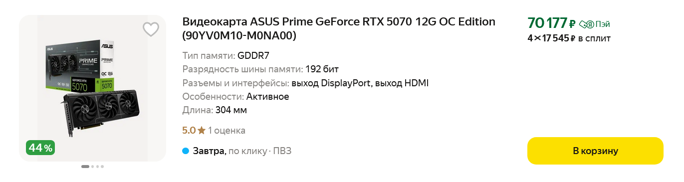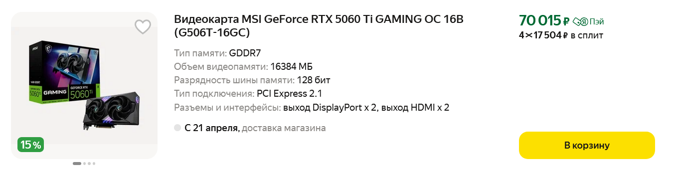 И именно GeForce RTX 5060 Ti в версии с 16 ГБ выглядит сегодня самой оптимальной видеокартой для игры с максимальными настройками на мониторе Full HD и даже способна справится со многими играми в разрешении QHD. Цены на эту модель на маркетплейсах, например, на Яндекс Маркете, сегодня начинаются примерно с 70000 рублей.