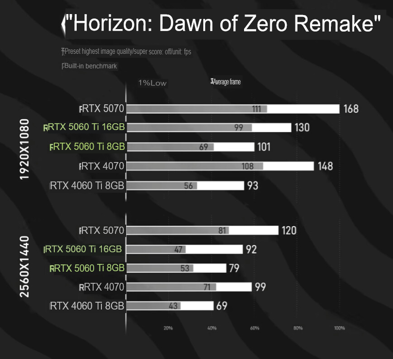 И никакого прорыва в качестве графики я не увижу, особенно учитывая то, что разрешение на новом мониторе вырастет на 77%, а разница в производительности между GeForce RTX 3060 и GeForce RTX 5060 Ti не везде дотягивает до 100%. Да, конечно картинка на новом мониторе станет гораздо плавнее, но как говорится в одной поговорке — "чтобы мы захотели что-то купить, нам надо это показать". То есть, если вы с удовольствием играете на 60-ти герцовом мониторе, то будете воспринимать картинку плавной и комфортной, пока не увидите плавность мониторов на 144 Гц и выше.