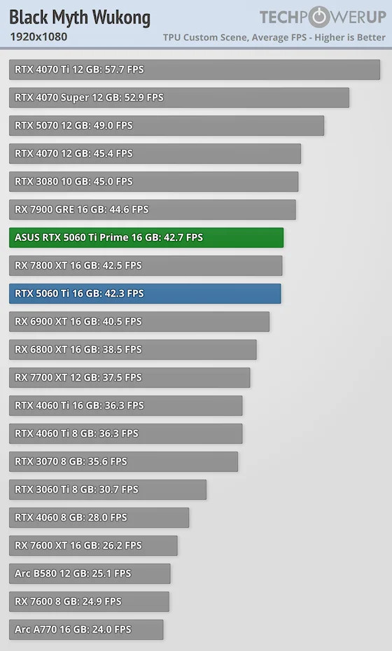 16 ГБ видеопамяти на GeForce RTX 5060 Ti будет хватать еще очень долго, и мы вполне можем увидеть ситуацию, когда в новых играх за счет объема VRAM она будет обходить GeForce RTX 4070 даже в разрешении Full HD, не говоря уже о более высоких разрешениях. Ну а пока она не смогла обогнать ее ни в одной игре, но в некоторых была очень близка по производительности.