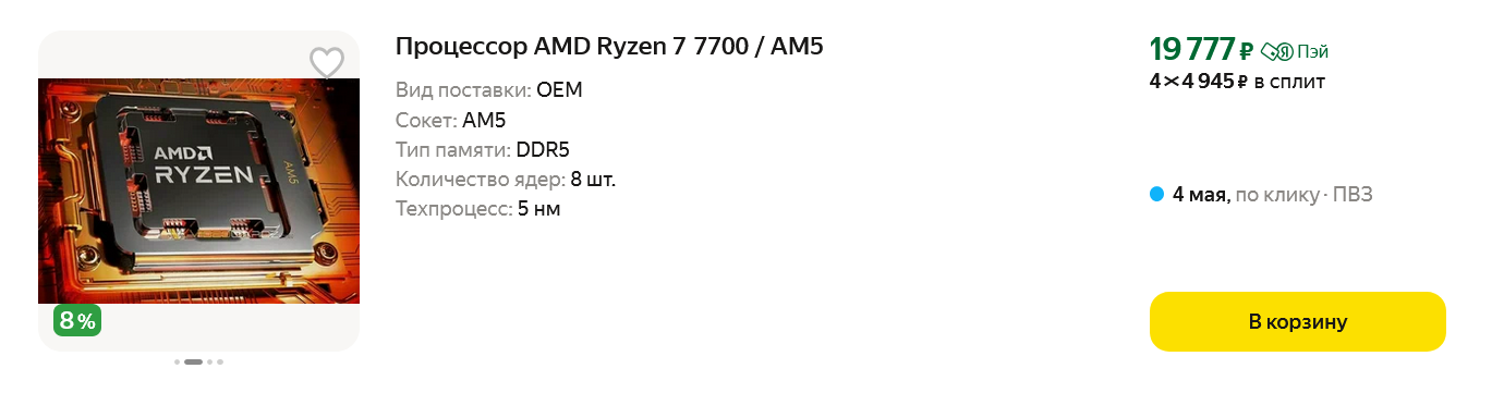 Эпоха актуальности шестиядерных процессоров, длящаяся уже почти восемь лет, подходит к концу. И чтобы понять это, достаточно взглянуть на тот прирост, которые дают процессоры с большим количеством ядер в системах с мощной видеокартой. Даже Cyberpunk 2077, игра, которой скоро стукнет уже пять лет, показывает неплохие возможности по распараллеливанию нагрузки, а что уж говорить про игры будущего. Поэтому наш выбор в эту сборку — восьмиядерный Ryzen 7 7700, цена на который упала до минимальной отметки за все время. Конечно, процессоры с 3D кэшем покажут себя гораздо лучше в будущих играх, но цена популярного Ryzen 7 7800X3D почти в два раза больше, чем у Ryzen 7 7700. И вложив эту разницу в видеокарту, можно получить больший выигрыш.