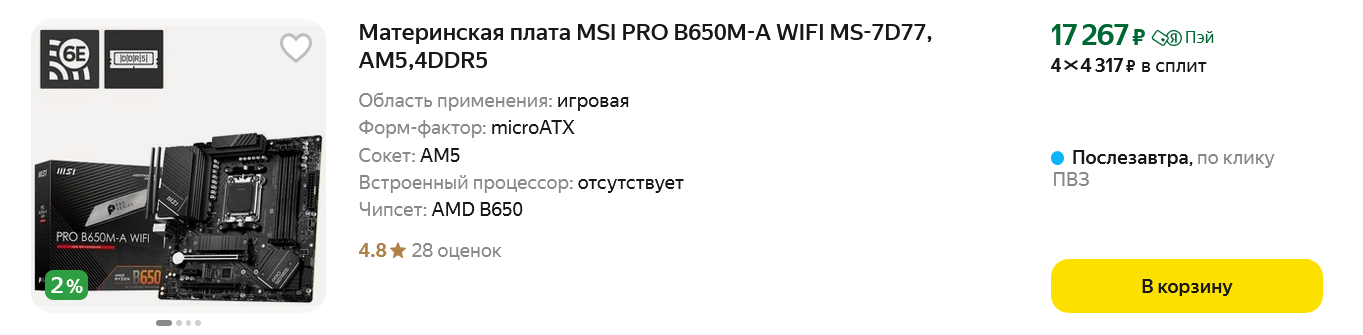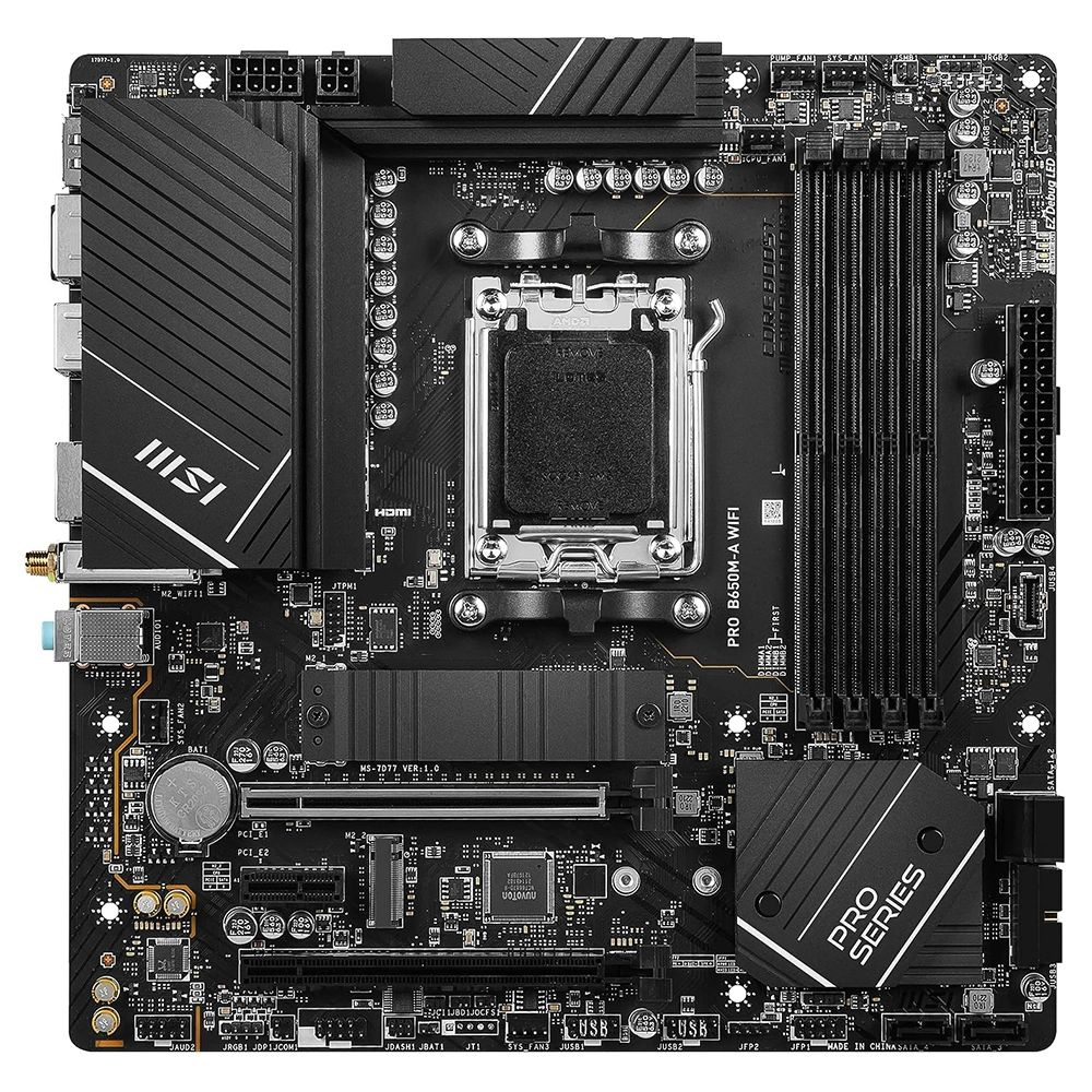 Ryzen 7 7700 предъявляет гораздо более высокие требования к VRM материнской платы, чем популярные шестиядерники, поэтому экономить на ней никак нельзя. И для нашей сборки золотой серединой станет плата MSI PRO B650M-A WIFI на чипсете AMD B650, которая имеет все, что нужно для сборки геймерского ПК, включая встроенные адаптеры Wi-Fi и Bluetooth.