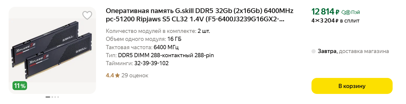 С выбором оперативной памяти для Ryzen 7 7700 можно не заморачиваться, объема ОЗУ в 32 ГБ хватит еще на годы, игры только недавно перешагнули отметку в 16 ГБ. Высокие частоты DDR5, которыми могут похвастаться системы Intel, Ryzen 7 7700 не возьмет, поэтому вполне хватит качественных модулей среднего уровня. Ведь даже разницу между частотой в 6000 и 6400 МГц без мониторинга в играх с упором в видеокарту заметить не удастся. Мы возьмем ОЗУ G.skill Ripjaws S5 (F5-6400J3239G16GX2-RS5K) с частотой 6400 МГц и довольно низкими таймингами 32-39-39-102.