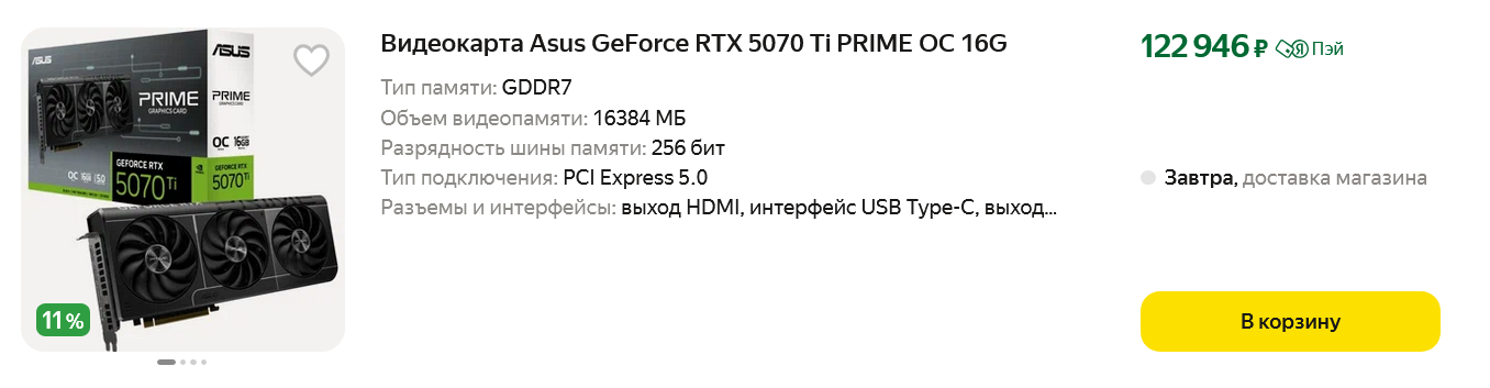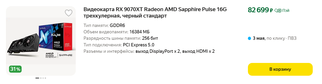Переходим к самому сложному выбору в этой сборке — ведь видеокарт, способных сохранить актуальность через пять лет, и при этом стоящих разумных денег, на рынке очень немного. Главным критерием выбора здесь будет сочетание большого объема видеопамяти с производительным чипом, ведь 15-20 FPS в новых играх, которые выдаст через пять лет недорогая Radeon RX 7600 XT с 16 ГБ VRAM, мало кого устроит. А вот новые видеокарты Radeon RX 9070 XT имеют весьма приличный запас по мощности, чтобы продержаться пять лет. Да и запаса видеопамяти в 16 ГБ для разрешения QHD хватит еще надолго, не говоря уже о Full HD.