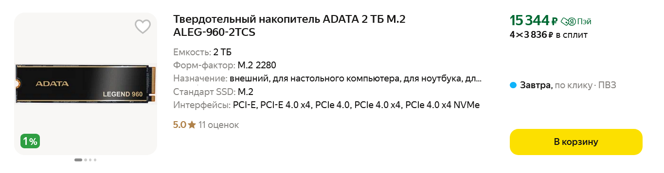 SSD для нашей сборки должен быть не только большого объема, так как игры через пять лет вполне могут достигнуть объема в 200-300 ГБ в среднем, но и надежным. Причем под надежностью понимается не абстрактная величина TBW (Total Byte Written) — сколько ТБ сможет записать SSD, а качество изготовления. Дешевые SSD обычно выходят из строя задолго до того, как исчерпают запас по записи, поэтому экономить на накопителе, покупаемом на такой долгий срок, не стоит. Мы возьмем SSD A-Data Legend 960 объемом 2 ТБ, зарекомендовавший себя как надежная и живучая модель.