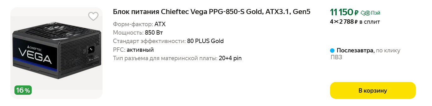 И Radeon RX 9070 XT, и GeForce RTX 5070 Ti видеокарты довольно прожорливые, первая ест 304 ватта, вторая 300 ватт, и любая из них будет главным потребителем энергии в нашей сборке. Для Radeon RX 9070 XT рекомендуется блок питания с большим запасом по мощности — 850 ватт, и мы не будем искушать судьбу и возьмем качественную и надежную модель на современной схемотехнике именно такой мощности. Например, Chieftec Vega PPG-850-S Gold, у которого есть современный кабель питания видеокарты 12VHPWR, технологии защиты OCP, OPP, OTP, OVP, SCP, SIP, UVP и достаточно тихий 135-мм вентилятор.