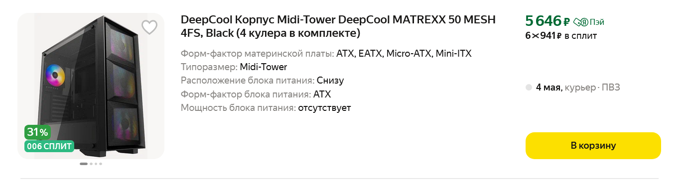 С одной стороны, на корпусе для ПК можно сэкономить, ведь на производительность он не влияет — главное, чтобы можно было установить побольше вертушек для охлаждения мощного железа. Да и чтобы получить по-настоящему хорошее качество изготовления, с продуманной конструкцией и толстым металлом, придется отдать весьма весомую сумму, более 10000 рублей. С другой стороны — собирать столь дорогую и качественную сборку в жестяном ящике весом 3 кг, это самое настоящее преступление, тем более, что мы собираем ПК на пять лет. Поэтому мы постараемся соблюсти баланс между ценой, качеством, внешним видом и способностями по вентиляции, выбрав один из самых популярных в 2025 году корпусов — DeepCool MATREXX 50 MESH 4FS.