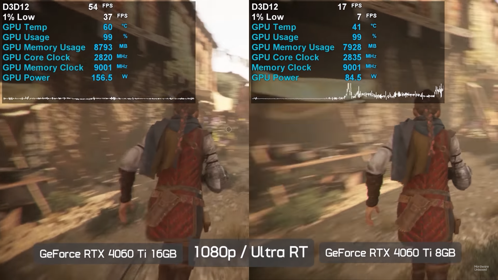 Вторым правилом, которое обеспечит долгую актуальность нашего ПК, станет достаточный объем видеопамяти у видеокарты. На малом объеме VRAM обожглись тысячи геймеров, которые покупали достаточно мощную видеокарту, которая начинала фризить и захлебываться от ее недостатка, хотя производительности чипа хватало с запасом. Это вечное соревнование системных требований новых игр и объема видеопамяти всегда проигрывали модели видеокарт, в которых не было запаса VRAM. Достаточно вспомнить такие модели, как Radeon R9 Fury, GeForce GTX 1060 3 ГБ, GeForce GTX 1650 SUPER, GeForce RTX 2060 и GeForce RTX 3070 Ti. А из свежих моделей наглядным примером стали GeForce RTX 4060 Ti в версиях 8 и 16 ГБ, производительность в некоторых новых играх у 8 ГБ версии иногда может падать до неиграбельных значений. Ведь именно недостаток видеопамяти наиболее явно заметен в любой игровой сборке — фризы и лаги гораздо хуже, чем стабильно низкий FPS.