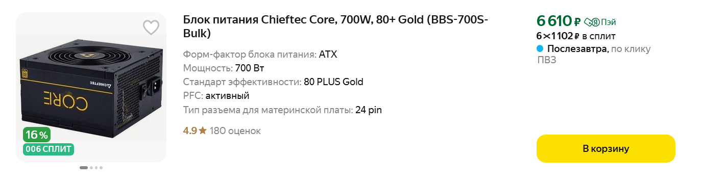 Но не сильно уступающий ему по качеству блок питания можно найти и за меньшую сумму, например, Chieftec Core BBS-700S мощностью 700 ватт.