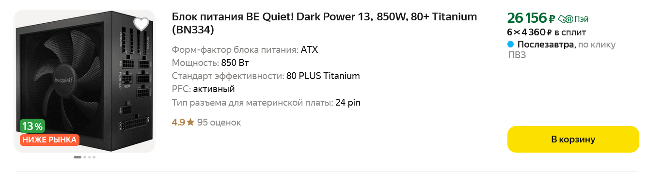 Компания Nvidia подбросила проблем геймерам, внедрив в свои новые видеокарты разъем питания 12VHPWR, который оказался проблемным, работающим на пределе мощности и в сети есть масса случаев с оплавлением этого разъема. А еще этот разъем неудобен тем, что на старых моделях блоков питания потребует использования громоздких и не эстетичных переходников, который сильно портят вид ПК изнутри. Качественные и дорогие блоки питания, выпущенные за последние пару лет, уже имеют разъем питания 12VHPWR и его более новую и безопасную версию 12V2х6, что позволит вам красиво подвести питание к видеокарте без использования переходников. Один из таких блоков питания — be quiet! Dark Power 13, мощностью 850 ватт и сертификат энергоэффективности 80 PLUS Titanium.