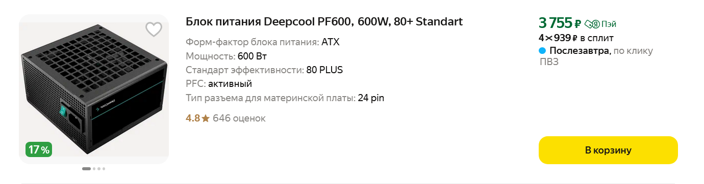 Кстати, подобные провода можно найти и на не самых дорогих моделях БП, например, у Deepcool PF600. Модели Deepcool серии PF стали очень популярны в недорогих сборках ПК за последнюю пару лет и такой БП с большим запасом мощности — вполне надежный выбор.