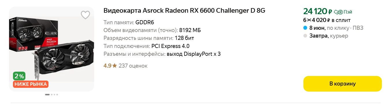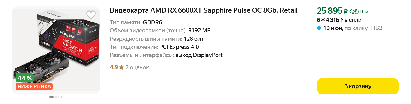 Почти по такой же цене можно найти Radeon RX 6600 XT, несмотря на возраст, эта видеокарта все еще актуальная для игр в разрешении 1080p.