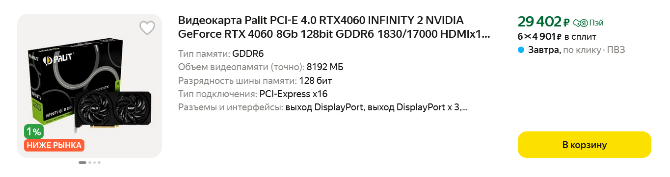 Но с большей вероятностью я бы взял GeForce RTX 4060. Ее вполне хватит для моих игр, а цена опустилась уже ниже 30000 рублей.