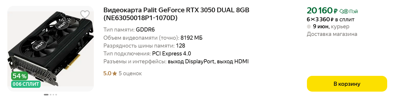 Я тоже отношусь к этой категории и на Авито обычно покупаю только недорогие комплектующие, чтобы в случае, если в них выявится скрытый дефект, потерять не так много денег. И если бы моя GeForce RTX 3060 вышла из строя, мне пришлось бы идти в магазин за новой видеокартой. Но, так как мощная модель мне не нужна, я бы присмотрелся к вот таким видеокартам на Яндекс Маркете, с ценой до 30000 рублей. GeForce RTX 3050 8 ГБ — стоит очень недорого, но при этом позволит задействовать в играх апскейлер DLSS, что уже позволит ей побороться с главным конкурентом.