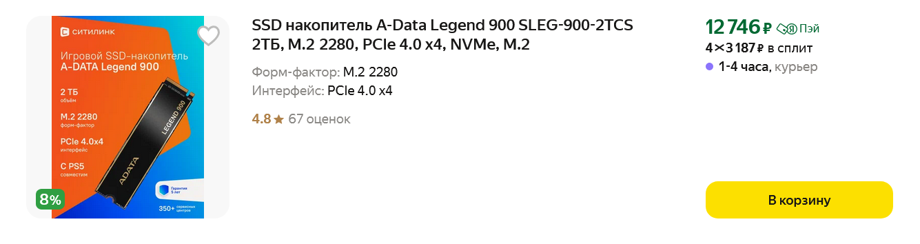 В-четвертых, стоят сегодня такие SSD очень недорого, а стоимость одного гигабайта у них гораздо выгоднее, чем у моделей меньшего объема. И если бы я выбирал себе SSD объемом 2 ТБ на Яндекс Маркете, то смотрел бы в сторону таких моделей: