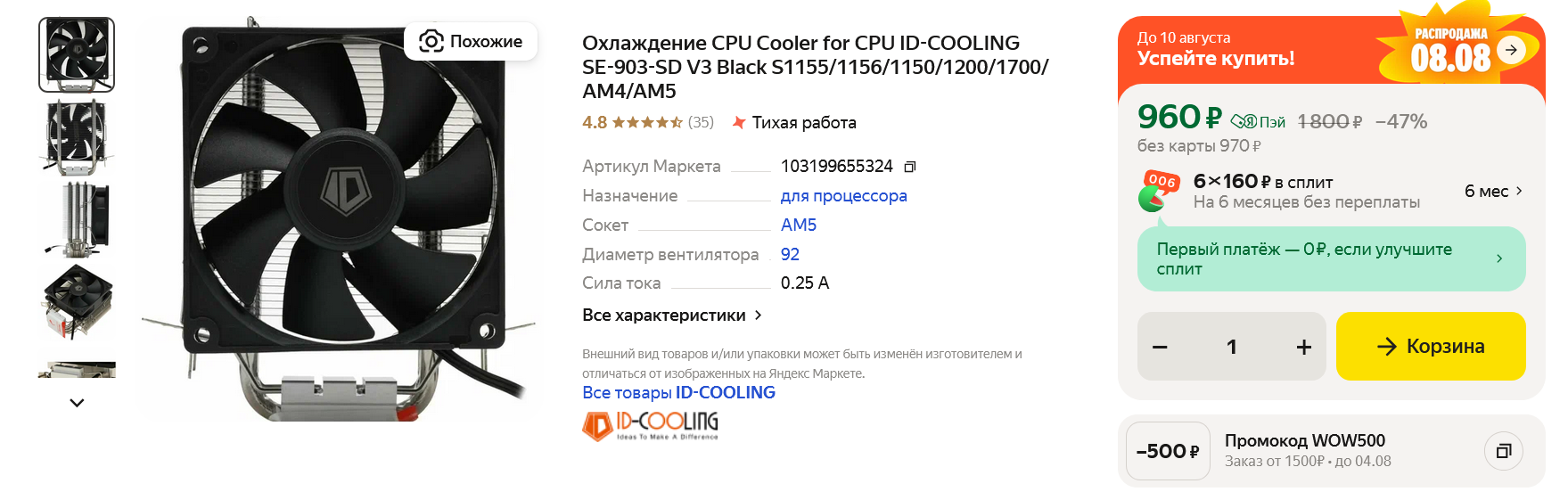 Если немного повозиться с настройками Ryzen 5 5600, то можно заставить работать его с заметно меньшим тепловыделением без потери производительности. Но мы, несмотря на то, что находимся на сайте Overclockers.ru, будем рассчитывать, что этой сборкой будет пользоваться неопытный пользователь, который не будет лезть в BIOS и что-то настраивать. Поэтому сразу возьмем кулер, достаточный для Ryzen 5 5600, например, ID-COOLING SE-903-SD V3 Black, который стоит сегодня очень выгодно по сравнению с моделями конкурентами.