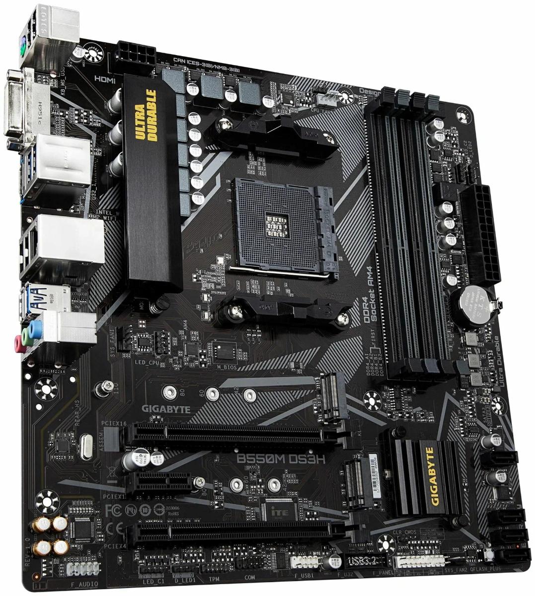 Поэтому наш выбор — материнская плата на чипсете AMD B550, с которой мы получим шину PCI Express четвертой версии. Хватит самого простого исполнения, главное, чтобы система питания была достаточной для Ryzen 5 5600 и потенциального апгрейда в будущем на восьмиядерный Ryzen 7 5700. Уже сегодня эти процессоры стоят очень недорого, а через пару-тройку лет на вторичном рынке эту модель можно будет купить за очень низкую цену. И в нашу сборку прекрасно вписывается по стоимости и функциям материнская плата GIGABYTE B550M DS3H.