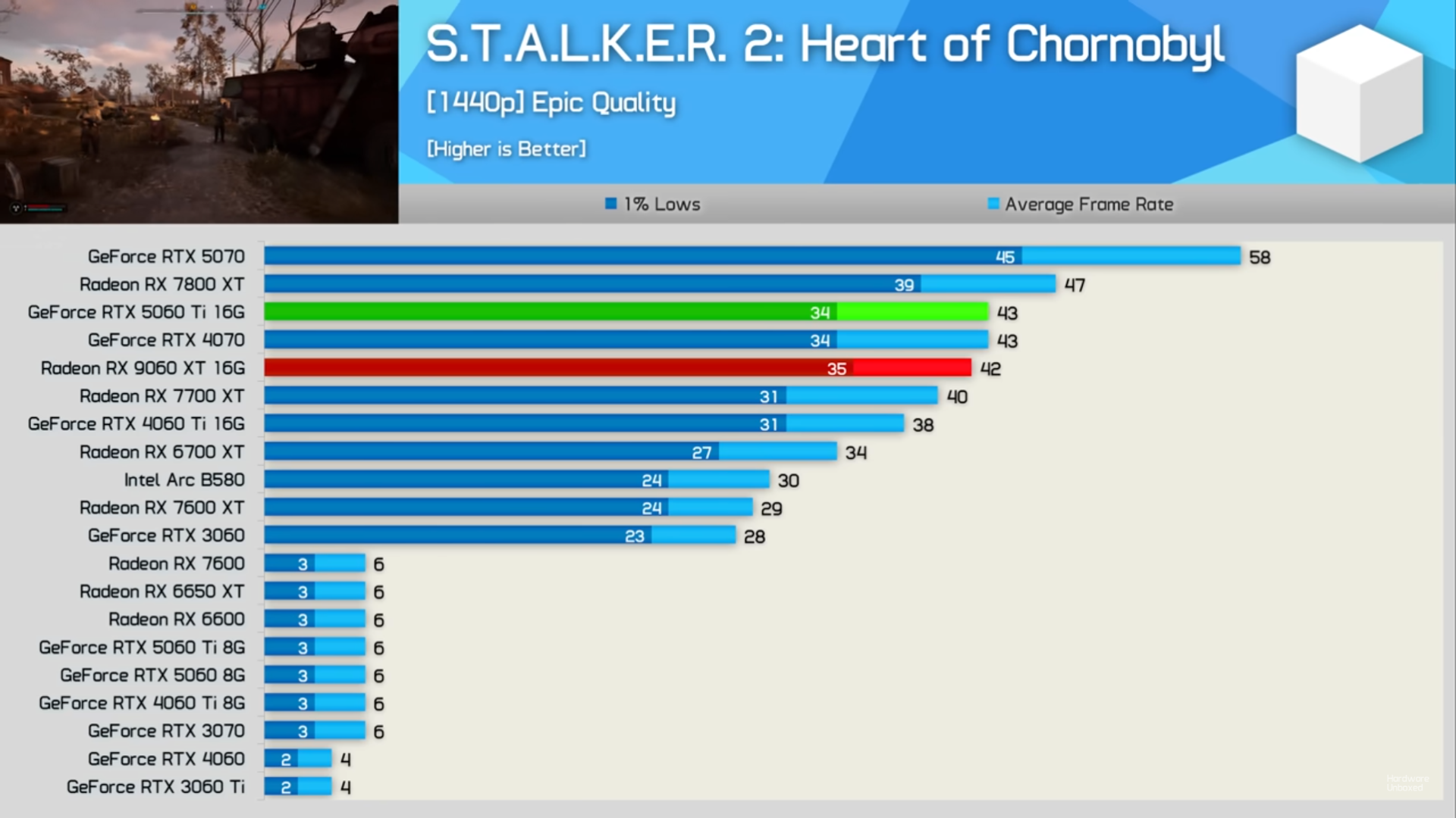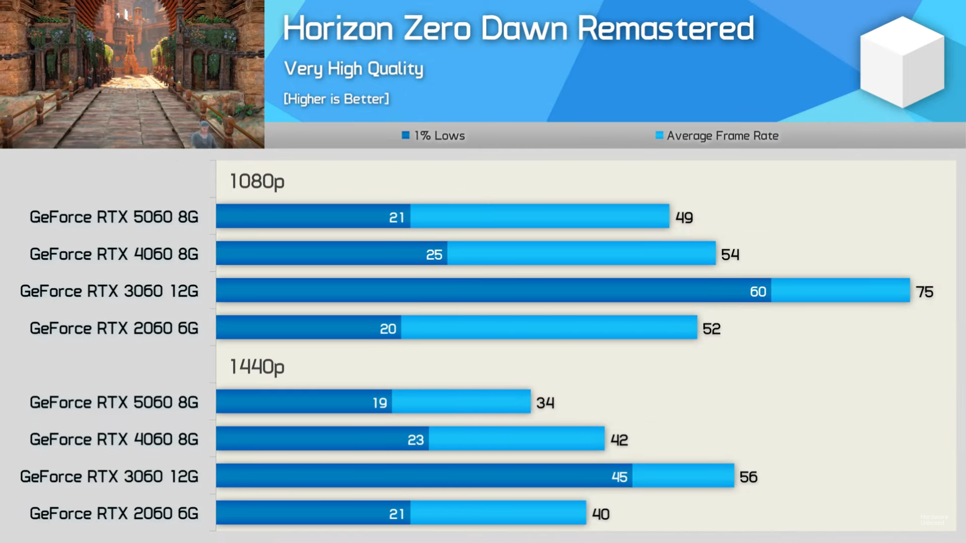 Видеокарта GeForce RTX 3060, если ее удастся найти по низкой цене, выглядит отличным выбором в старую систему с шиной PCIe 3.0. У нее 16 линий PCI Express, да еще и 12 ГБ быстрой видеопамяти на 192-битной шине, чем она отлично выделяется на фоне новеньких GeForce RTX 4060 и GeForce RTX 5060, которым отсыпали лишь восемь гигабайт. И в некоторых играх можно видеть вот такую картину.
