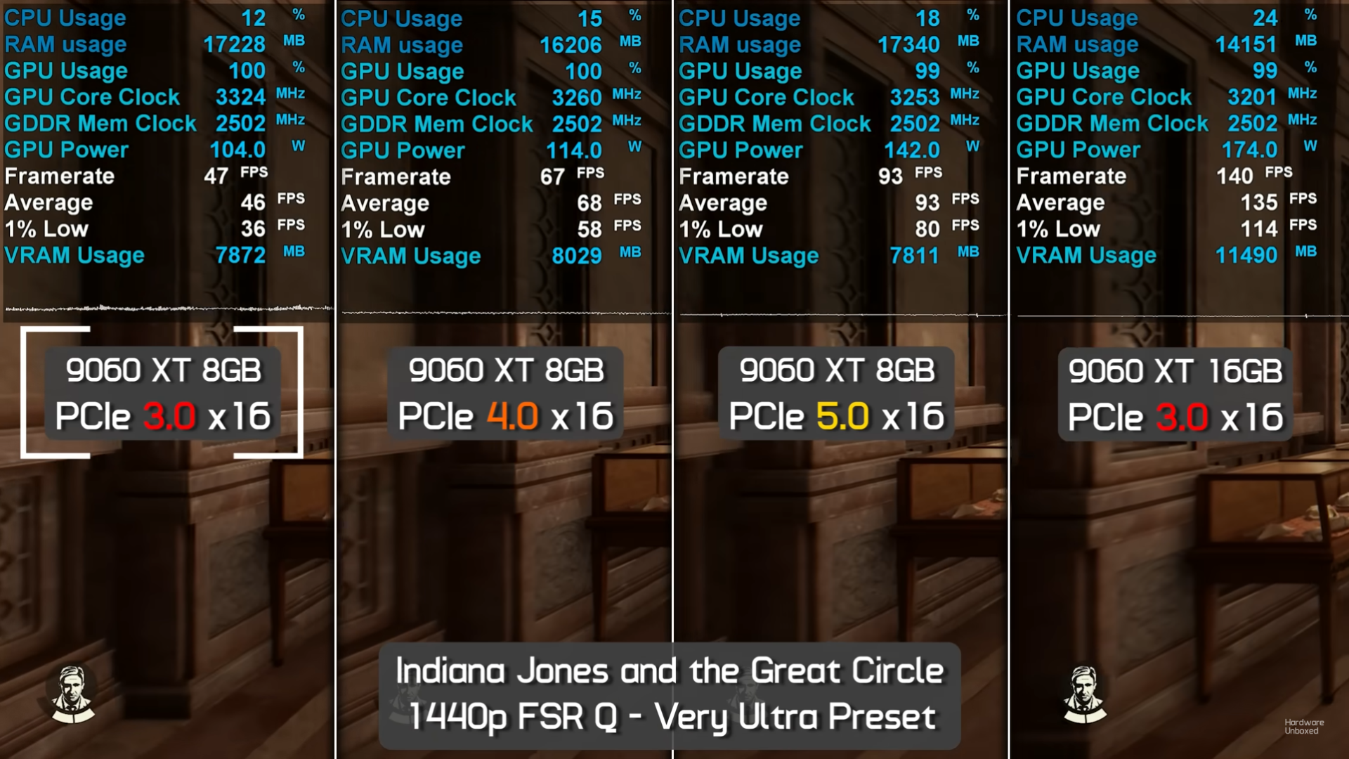 Добавив немного к стоимости GeForce RTX 5060, можно найти Radeon RX 9060 XT в версии 8 ГБ. В нетрассированных играх эта видеокарта обгоняет GeForce RTX 5060, а еще может похвастаться полноценными 16-ю линиями PCI Express. Казалось бы, идеальный выбор для старых систем с третьей версией шины PCIe, но нужно учитывать, что при переполнении видеопамяти на Radeon RX 9060 XT FPS будет гораздо сильнее падать на старых версиях шины. Вот такую картину можно наблюдать в игре Indiana Jones and the Great Circle, поэтому, покупая Radeon RX 9060 XT 8 ГБ, нужно рассчитывать, что настройки в играх придется уменьшать так, чтобы уложиться в восемь гигабайт VRAM.