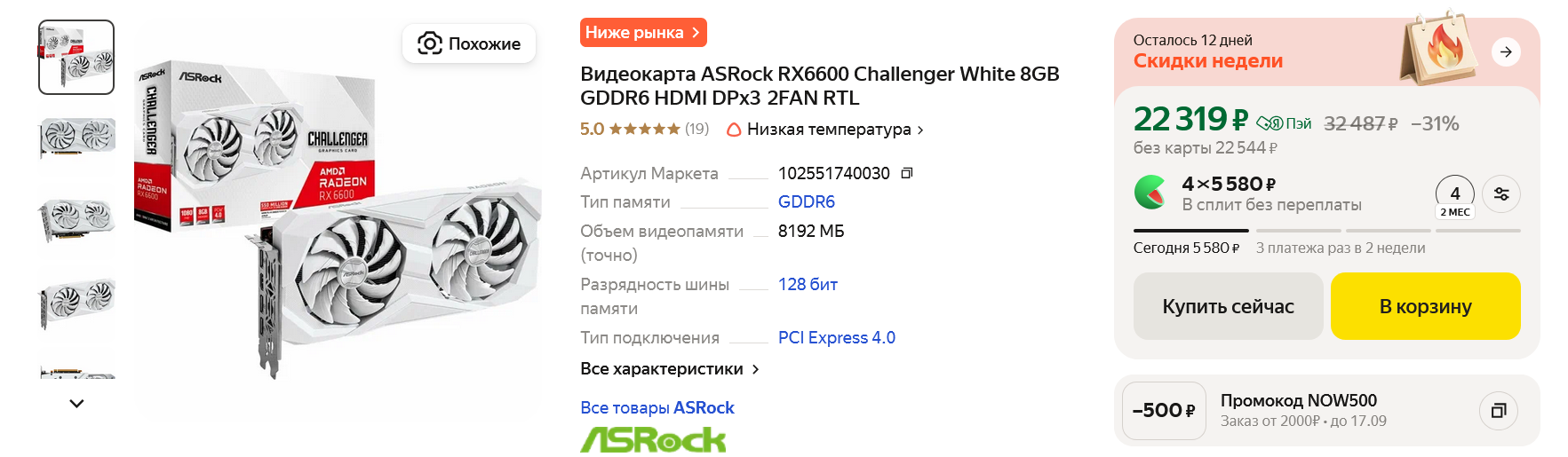 После выхода неплохих видеокарт среднего уровня линейки GeForce RTX 4000, а затем и GeForce RTX 5000, цены на аналоги от AMD стремительно пошли вниз. Трассировка лучей на них работает хуже, а технология апскейлинга FSR дает заметно более худшую картинку, чем DLSS. Но, как обычно, цена способна исправить многие недостатки, и за те 22 тысячи рублей, а то и меньше, Radeon RX 6600 выглядит отличным выбором для игры на средних настройках в разрешении Full HD. Причем за эту цену можно пренебречь даже потерями из-за всего восьми линий PCI Express, и такая видеокарта отлично подойдет для Ryzen 5 5500 и Ryzen 5 5600, работающих в материнской плате на чипсете AMD B450.