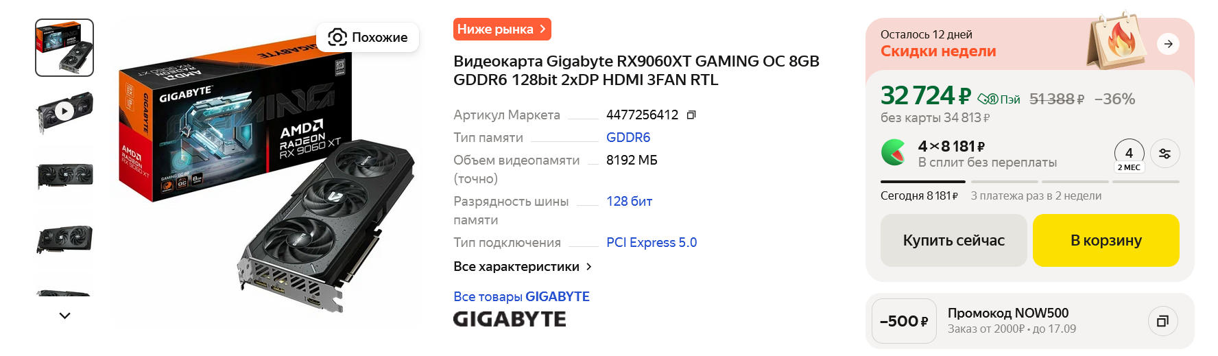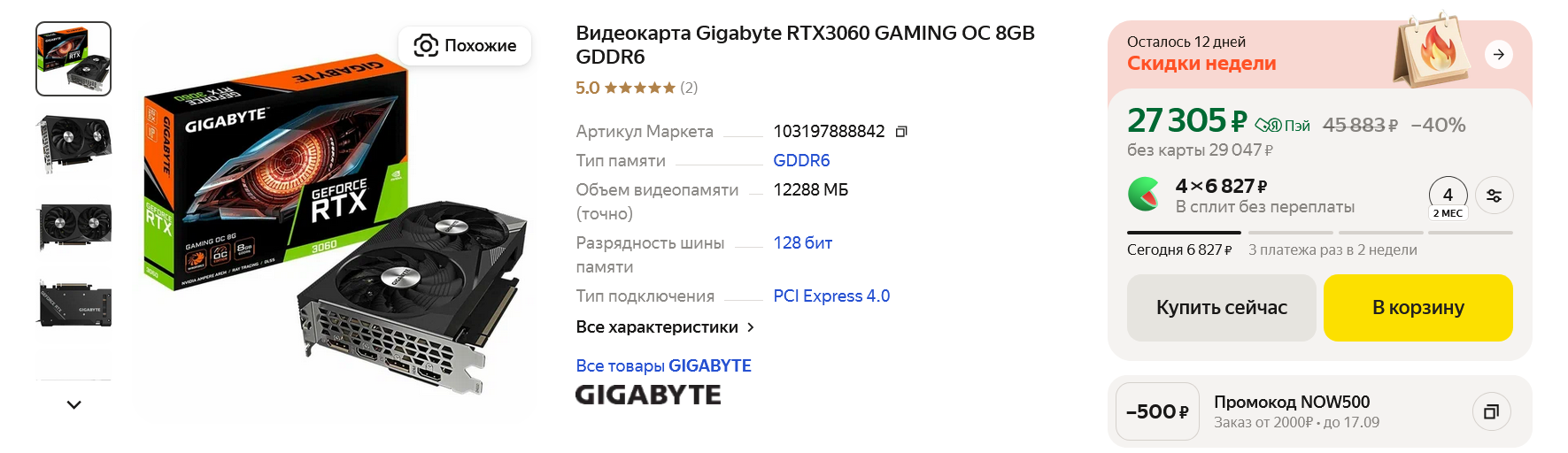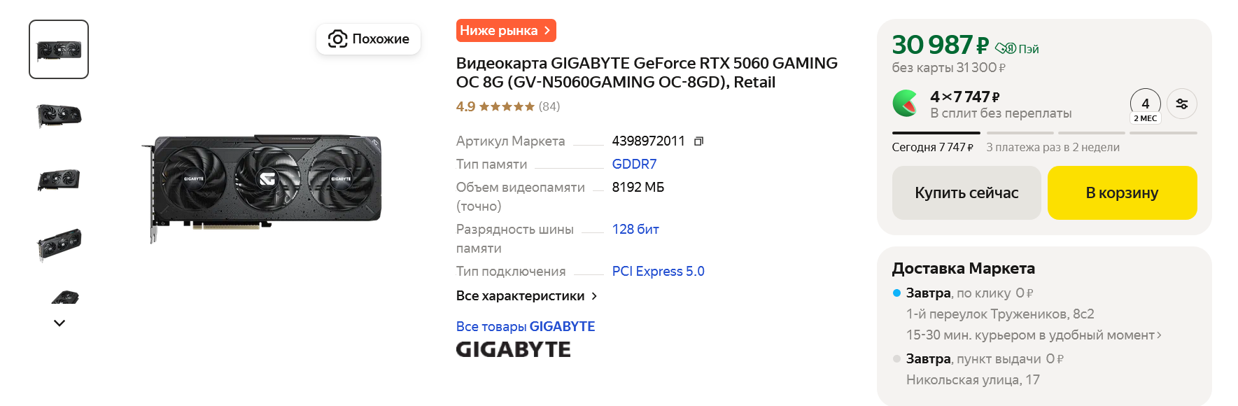 Но нужно учитывать, что чип у GeForce RTX 3060 уже слабоват, и в большинстве игр она сильно отстанет от GeForce RTX 5060, поэтому ее покупка новой имеет смысл только примерно за 25000–27000 рублей. А на вторичном рынке ее можно найти за гораздо меньшую цену, и таких видеокарт там масса, главное — выбрать довольно свежий экземпляр, который не успел поучаствовать в майнинге.