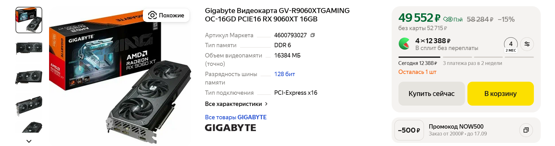 Еще немногим дороже будет стоить видеокарта Radeon RX 9060 XT в версии с 16 ГБ VRAM. Но глядя на такую разницу в цене с версией на 8 ГБ, поневоле задумаешься — «а стоит ли удвоенный объем видеопамяти такой огромной доплаты»? Компания AMD предлагала в рекомендованных ценах гораздо меньший разрыв в цене между версиями Radeon RX 9060 XT на 8 и 16 ГБ, но рынок внес свои коррективы. Да, Radeon RX 9060 XT 16 ГБ хороша — и видеопамяти хватит надолго, и шина PCI Express не урезана, но уж слишком близко по цене оказываются гораздо более привлекательные GeForce RTX 5060 Ti 16 ГБ и даже GeForce RTX 5070. Но отдавать столько за видеокарту для старого ПК стоит только в том случае, если планируется апгрейд, например, на платформу AM5, а видеокарта останется та же.