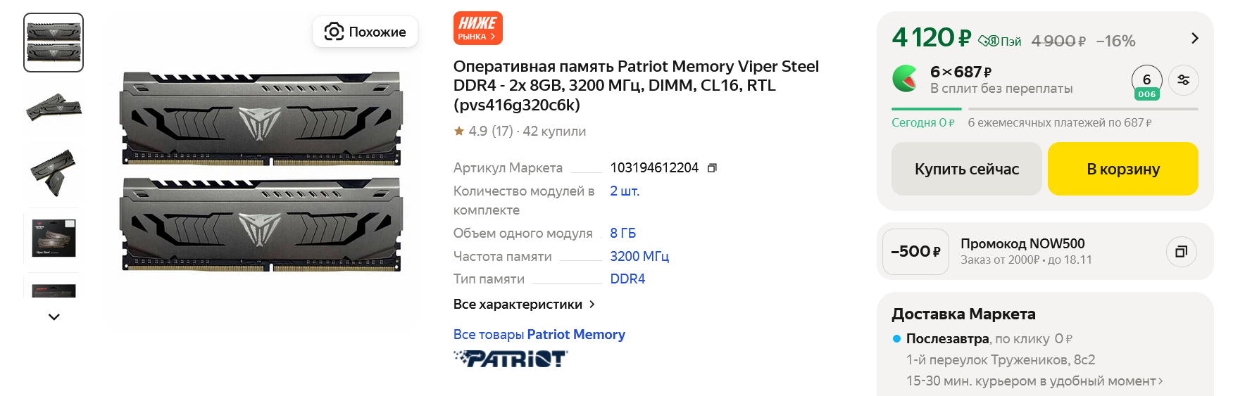 Тем более, что при желании можно без проблем купить и поставить в ПК 32 ГБ ОЗУ в будущем, когда они понадобятся - это один из самых простых вариантов апгрейда, проще только замена или добавление нового SSD. Мы возьмем модули Patriot Memory Viper Steel с частотой 3200 МГц и таймингом CL 16 за 4120 рублей - это одно из самых недорогих предложений на рынке.