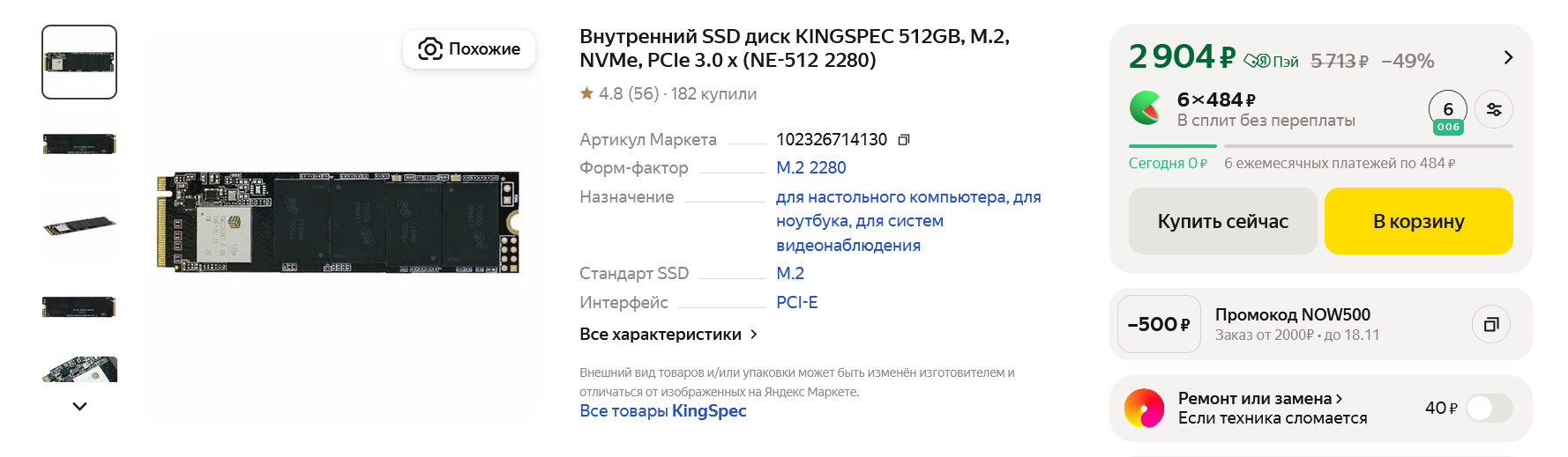 Еще одна возможность сэкономить — выбрать SSD объемом поменьше и не гнаться за высокими скоростями записи. Тем более, что список игр у нас небольшой, в нем отсутствуют огромные одиночные игры с весом по 150 ГБ и SSD объемом 512 ГБ для этой сборки хватит с лихвой. Например - KINGSPEC (NE-512 2280), очень недорогой SSD с неплохими скоростями чтения и записи и приличной выносливостью. Суммарное число записываемых байтов (TBW) у него равно 349 ГБ, что для модели такого объема очень неплохо.