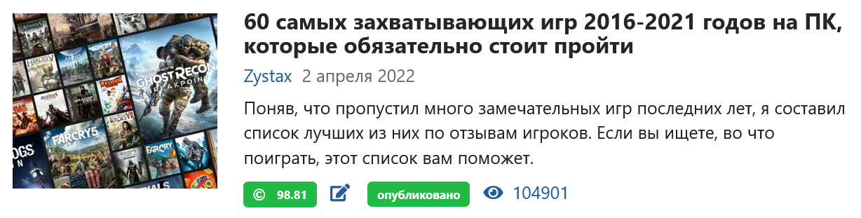 "Во что бы поиграть?" – главный вопрос, который задает себе каждый ПК-геймер с завидной регулярностью. И лучше всего на него ответят публикации с подборками игр разных жанров, которых я написал немало. А все потому, что я и сам постоянно ищу игры для прохождения – у меня в браузере есть уже сотни вкладок с лучшими играми разных жанров и сайтами-агрегаторами, на которых можно найти практически любую игру. Подобные публикации практически не устаревают, поскольку в хорошие игры мы будем играть и через десять, и даже через двадцать лет.