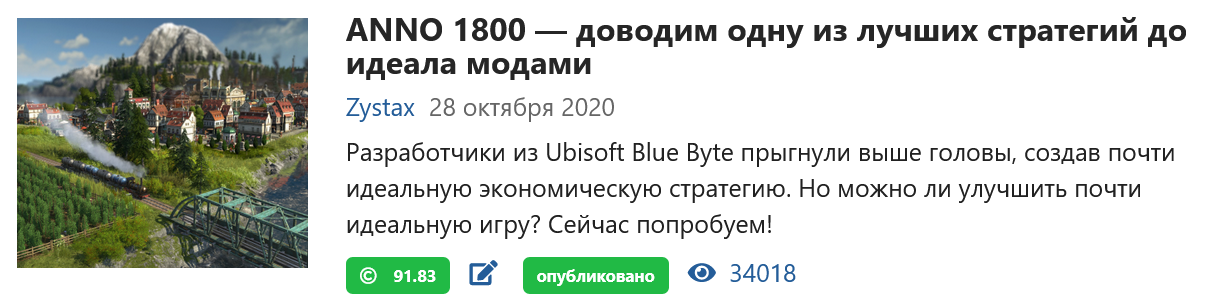 Периодически я пишу обзоры отдельных игр, которые мне очень понравились, но таковых вышло не очень много. Однако все равно очень приятно, когда иногда видишь ссылку на свою старую статью про моды для экономической стратегии Anno 1800 в комментариях в соцсетях, так как более подробного гайда про них пока так никто и не написал.