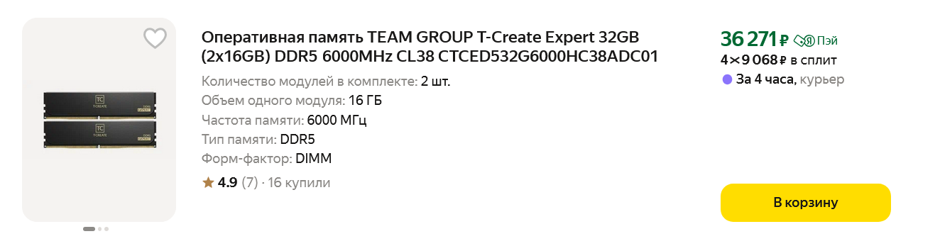 А если посмотреть на самую актуальную оперативную память для современных ПК – стандарта DDR5, объемом 32 ГБ и с частотой 6000 МГц, то стоимость таких комплектов и вовсе бьет рекорды. Например, на Яндекс Маркете за такой комплект TEAM GROUP T-Create Expert просят более 36000 рублей.