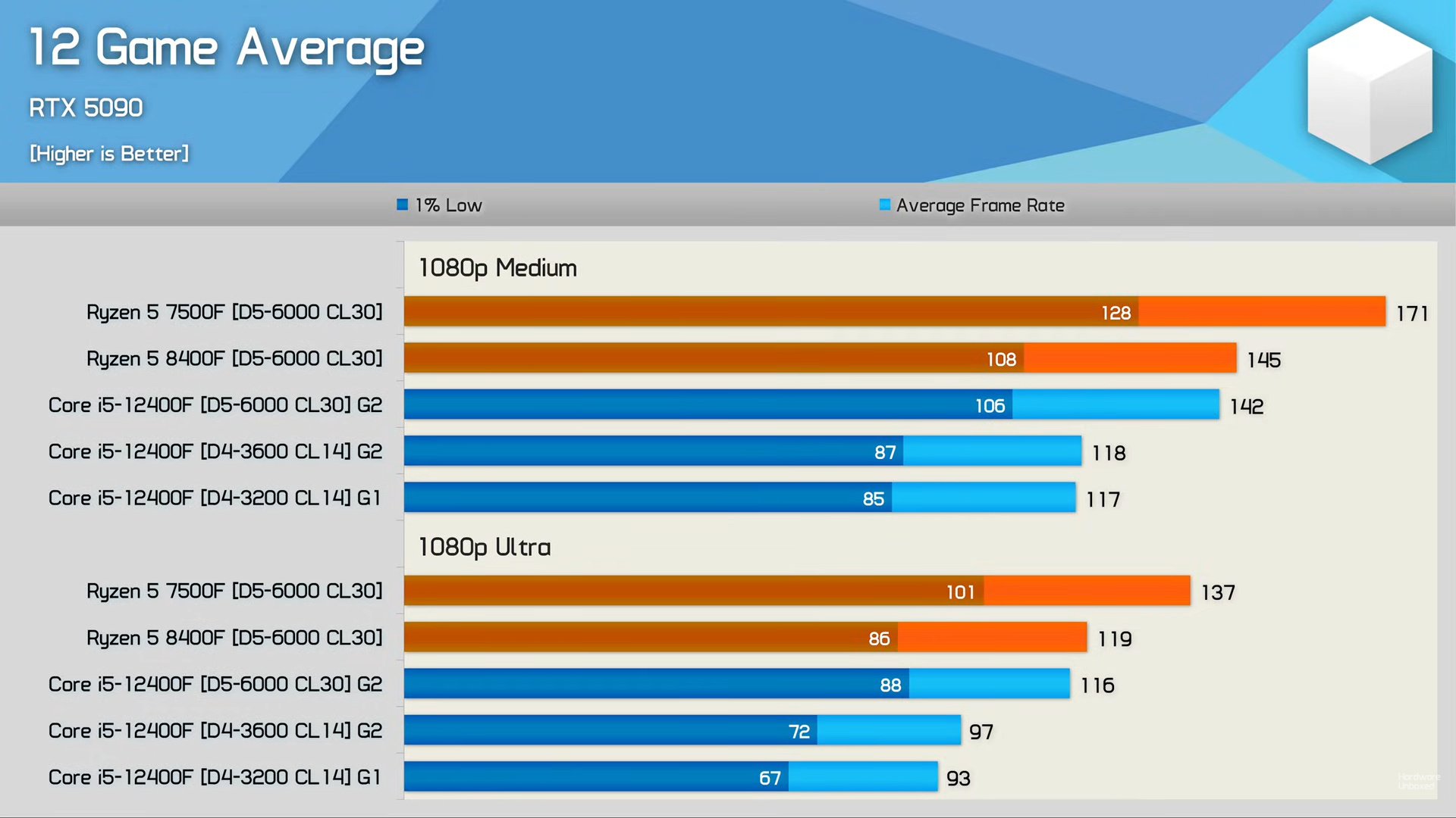 И для некоторых процессоров будет гораздо практичнее взять аналог по производительности, работающий с памятью DDR5, даже значительно переплатив за нее. Или, в случае с платформой LGA 1700, которая позволяет делать сборки как с ОЗУ стандарта DDR4, так и с DDR5, сделать ставку на последнюю. Ведь даже для шестиядерников среднего уровня работа с памятью DDR5 выводит их на совсем другой уровень производительности. Например, на графике выше видно, какой буст получает бюджетный Core i5-12400F, память DDR5 ставит его на один уровень с Ryzen 5 8400F, но и стоимость комплекта ОЗУ DDR5 для него обойдется сегодня в два раза дороже самого процессора.