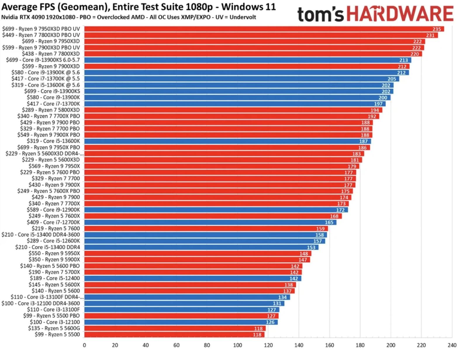 Как видите, на рынке процессоров есть из чего выбрать, если вы решите сэкономить на ОЗУ и взять ее прошлое поколение. Ну а ориентироваться в их производительности вам поможет вот такая подробная таблица с авторитетного сайта Tom's Hardware, где все актуальные процессоры протестировали в нескольких играх как с оперативной памятью DDR4, так и DDR5, и с видеокартой GeForce RTX 4090.