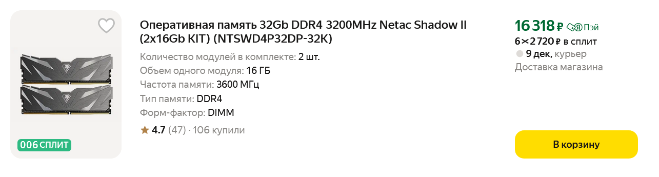 Но что делать тем геймерам, которые понимают это и решили собрать игровой ПК прямо сейчас, но денег на то, чтобы покупать 32 ГБ оперативной памяти DDR5 по цене видеокарты GeForce RTX 5060, у них нет? Одним из выходов станет сборка ПК на базе более дешевой оперативной памяти DDR4, комплект которой актуального объема в 32 ГБ и с частотой 3200 МГц пока можно найти за 16000-17000 рублей, например - Netac Shadow II.