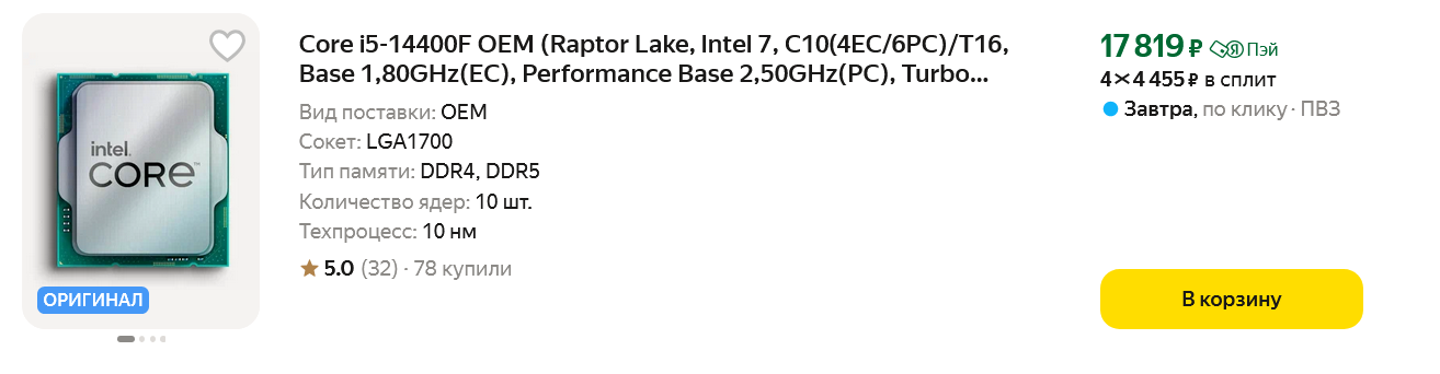 И, наконец, последним процессором в подборке станет Core i5-14400F, он уже довольно дороговат, а в играх немного отстает от Core i5-12600KF и не имеет возможности разгона и тонкой настройки многих параметров. Но если Core i5-12600KF исчезнут из продажи, то и этот вариант можно рассматривать как последний для сборки ПК на ОЗУ DDR4. С более мощными моделями уже стоит смотреть в сторону DDR5, хоть и более дорогой.