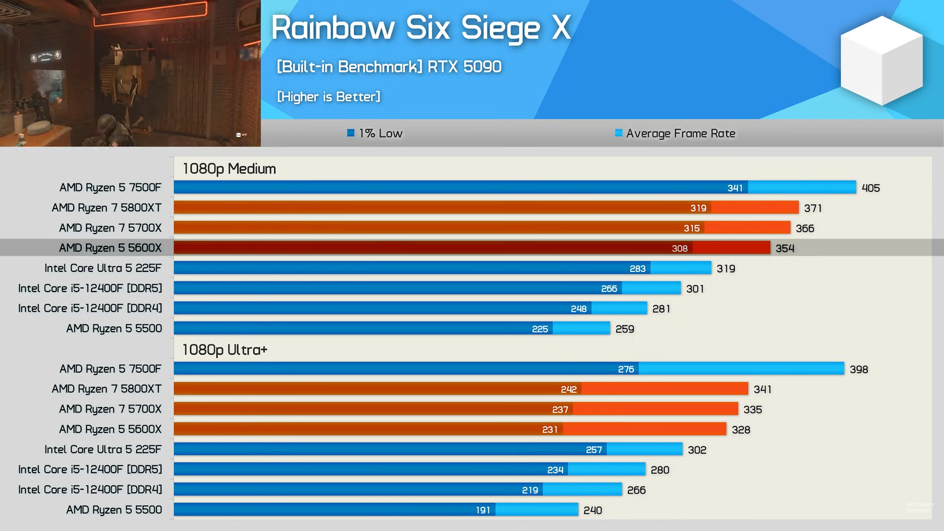 В игре Rainbow Six Siege Ryzen 5 5600X на средних настройках графики умудрился обойти даже новейший Core Ultra 225F!
